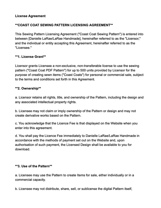 Coast Coat Licensing Agreement for Commerical Selling